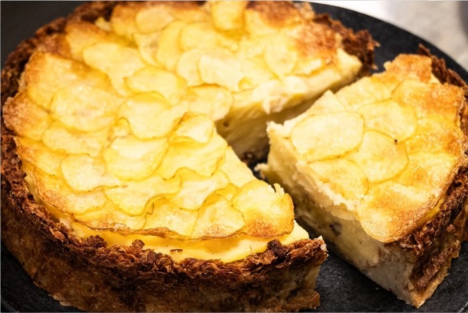 Uma torta contemporânea feita com crosta crocante de batata ralada e recheio cremoso de purê aromatizado, podendo ser preparada com bacon defumado ou palmito para versões diferentes de sabor.
